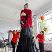 Rong: En we wilden ook graag een grotere reus: bij de viering van 150 jaar Schouwburg speelden reus Da Tong en reuzin Fiere Margriet een liefdesscène. Da Tong was toen 2,2 meter hoog, reuzin Fiere Margriet is wel 4 meter hoog. Niet ideaal dus voor een liefdesrelatie! Het idee voor een nieuwe versie van Da Tong groeide: grotere wielen en een grotere romp, maar wel even levendig als een mens.
