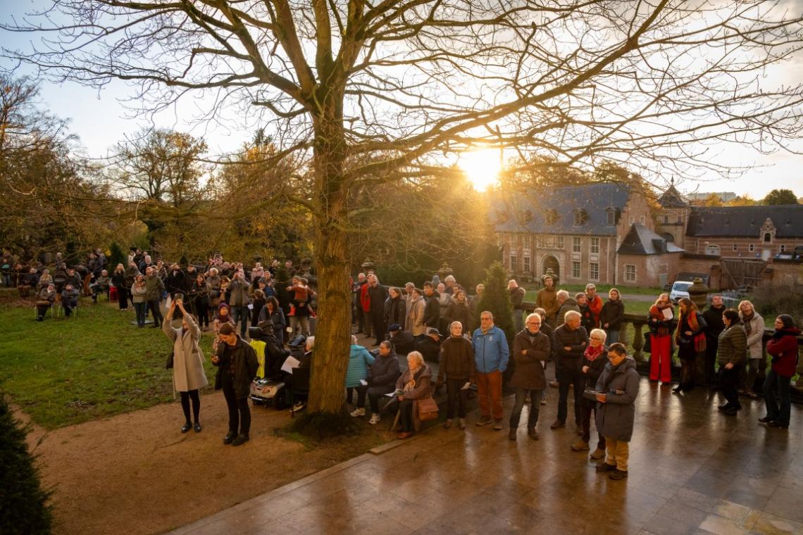 Om 16 uur volgde een bijzonder duoconcert van sopraan Noémie Schellens en beiaardier Luc Rombouts. De zangstem weerklonk samen met de beiaard over de Abdij van Park. De Vrienden van de Abdij van ’t Park leidden luisteraars op het ritme van de muziek door het abdijdomein. Aansluitend zongen de aanwezigen onder leiding van sopraan Noémie Schellens samen voor vrede met kaarslicht op het Neerhof.