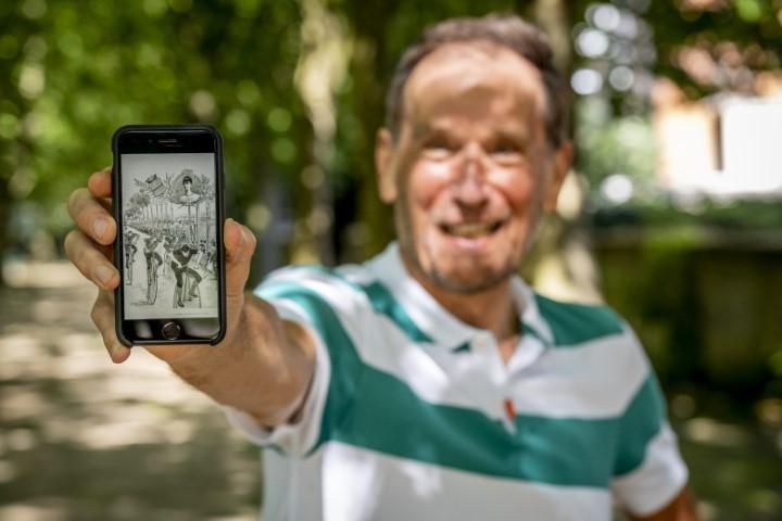 Nan: Ik deelde mijn kennis en expertise. Ik deed ook nog bijkomend onderzoek en dacht mee over interessant beeldmateriaal. Voor 1914 zijn er veel tekstuele bronnen, maar weinig afbeeldingen. Een foto nemen van een wielerwedstrijd in actie was toen nog veel te moeilijk. Van een van de eerste wielerwedstrijden in Leuven in september in 1886 bestaat wel een mooie tekening van Carl Meunier, zoon van de bekende Constantin Meunier. Die wedstrijd vond plaats in het stadspark, vandaar dat ik dat als locatie koos voor de foto bij dit interview.